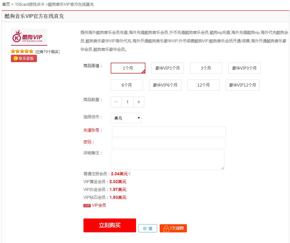 三、点击商品详情,进入充值页面,输入您想购买的数量和想充值的酷狗账号,点击立即购买;